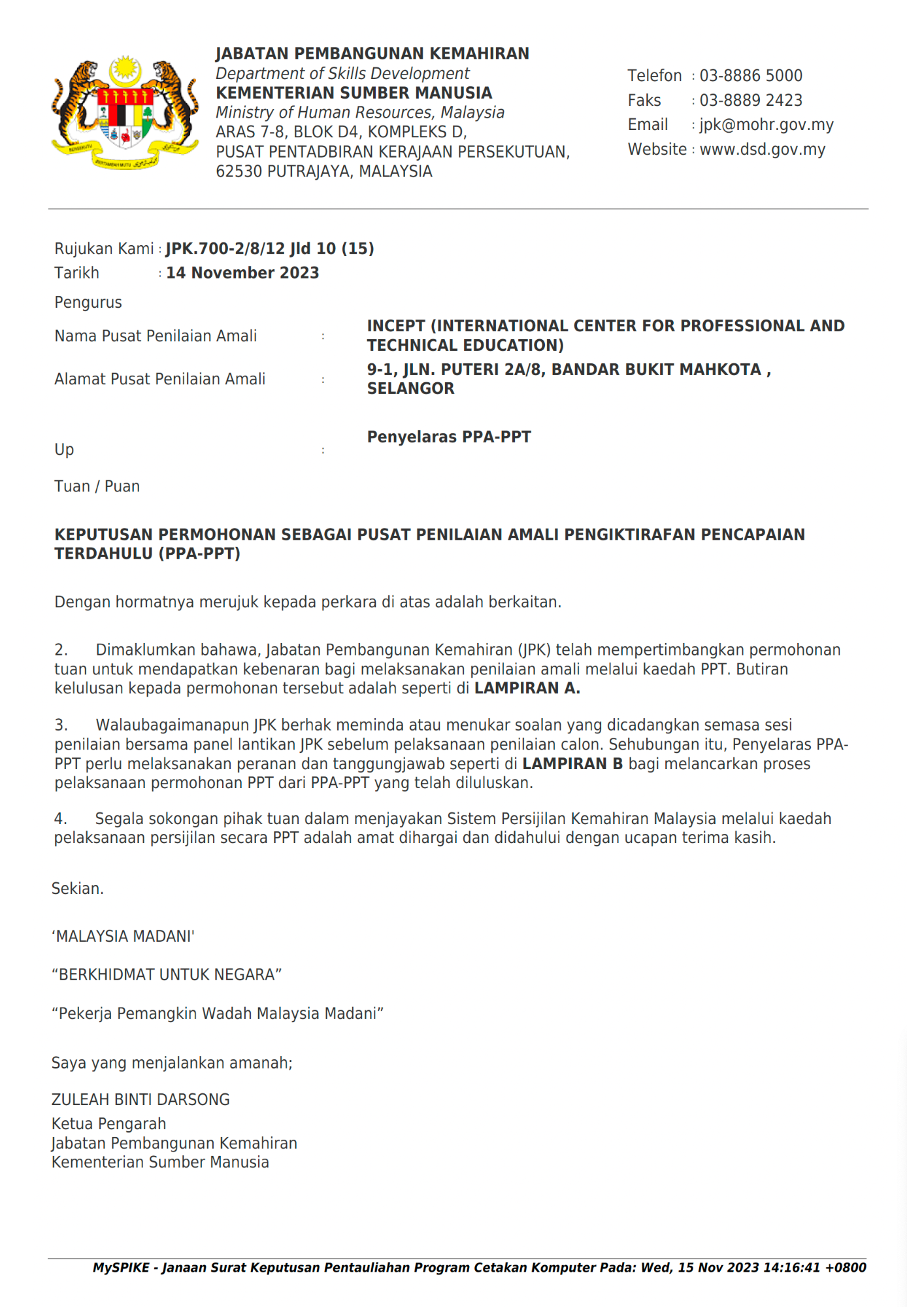 - Tempoh Kelulusan: Latihan Tenaga Pengajar : 14 November 2023 - 13 November 2026