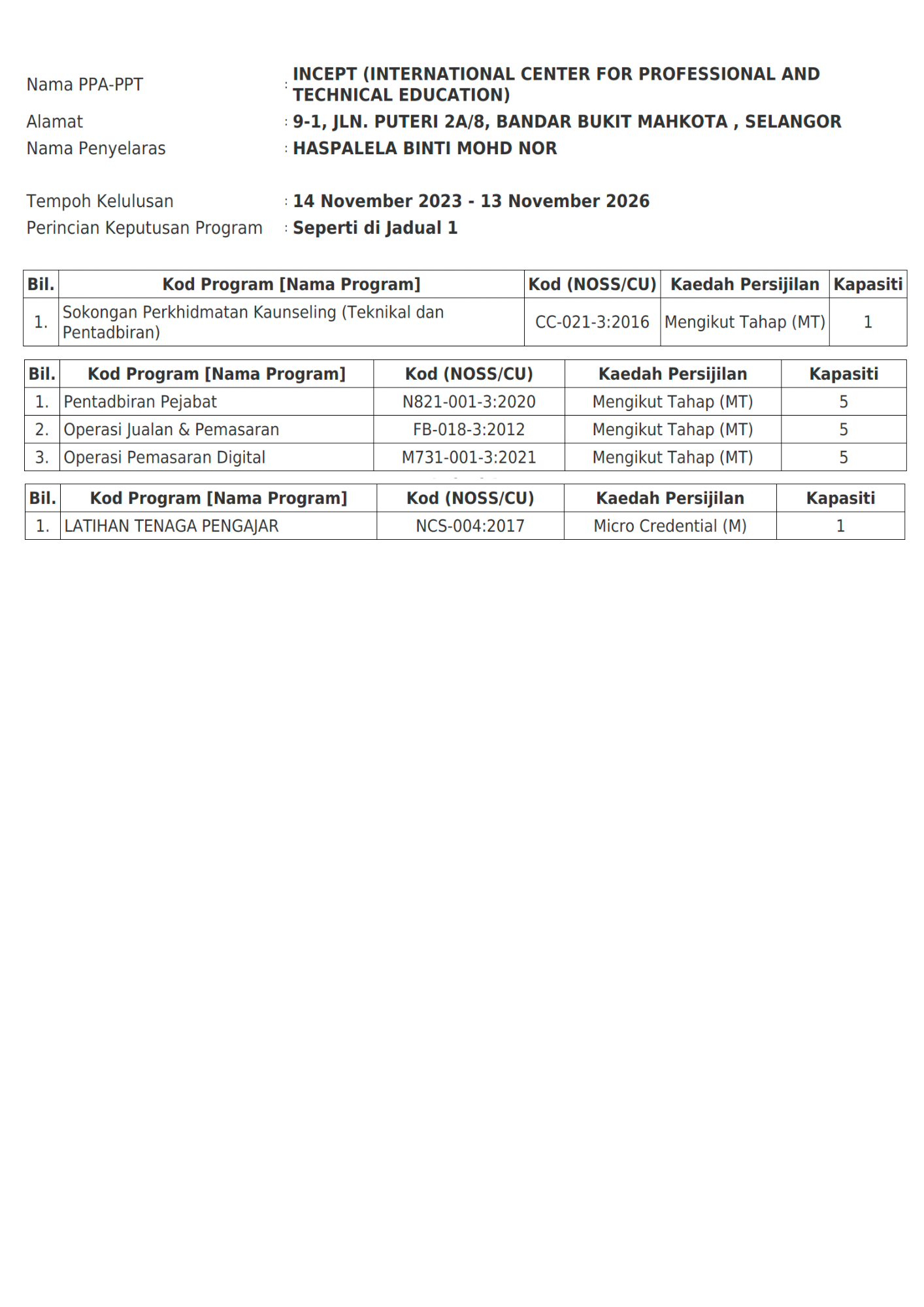 - Tempoh Kelulusan: Latihan Tenaga Pengajar : 14 November 2023 - 13 November 2026